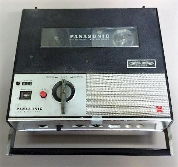 Objeto rectangular que se encarga de grabar los sonidos en una memoria de cinta. Posee diferentes botones y orificios para distintos comandos dentro de los cuales se incluyen: reversa, adelante, detenerse, grabar, volume y tono, entre otros. Ofrece la opción de utilizarlo con electricidad o con baterías. Presenta algo de corrosión en el metal, así como varias abrasiones. Tiene cinta adhesiva en la parte posterior para mantener guardado el cable eléctrico. Se encuentra en buenas condiciones.