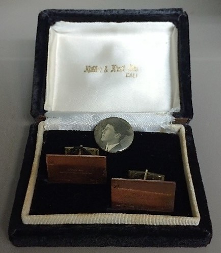 Estuche: Objeto rectangular utilizado para guardar y exhibir los gemelos y el broche. Su esqueleto está hecho de madera y forrado con una tela negra de textura suave. En su interior, la tapa esta forrada con tela blanca y tiene escrito en letras dorados: Kilbler & Krick Lido Cali. La base interior es color negra como la tela del exterior y posee dos amarres para mantener sujetos los gemelos. Se encuentra en buenas condiciones.