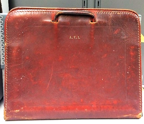 Maletín rectangular en cuero color caoba. La cara principal externa, tiene grabado las letras A.F.I., en el cuadrante superior central. Sobre esa inscripción se encuentra la agarradera y en esa misma ubicación, pero en la cara posterior, se encuentra la otra agarradera. En ambas cara tiene una franja que cruza toda la superficie hasta formar un rectángulo con puntas ovaladas a 4 cm de los bordes del cuerpo del maletín. Las dos caras muestran deterioro, abrasiones, desgarre y perdida del material en los cuadrantes inferior izquierdo y derecho. Las dos caras están unidas por un cierre en metal que resguarda en su interior con dos bolsillos. Uno de ellos con cierre y el otro no. El interior del maletín se encuentra en excelente estado.