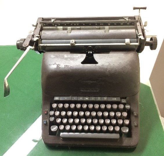 Máquina de escribir alemana marca Adler con un carro de 40 cm. Es color marrón, tiene una capa de pintura aplicada sobre la pintura original (se puede deducir debido a que la pintura se encuentra arrugada en la superficie). Se observan huellas de la pérdida de pintura anterior, lo que demuestra que la superficie no fue pulida antes de pintar. El logo y el nombre de la compañía fueron pintados con la misma pintura de la superficie. Un detalle no característico de la compañía, ya que solía colocar su emblema de un color plateado, para que el mismo resaltara sobre la superficie. Presenta corrosión del metal. Posee todas las partes necesarias para cumplir su función de máquina de escribir.